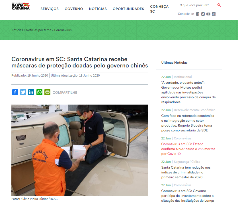 近日,巴西圣卡塔琳娜州政府网站刊发消息,州政府经由国际关系秘书处收到福建省捐赠的15000个口罩,其中包括5000个医用防护口罩和10000个一次性使用医用口罩。